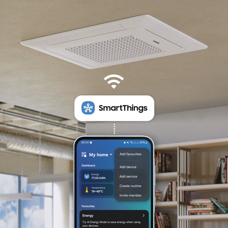 Mit der SmartThings App lassen sich Klimageräte bequem per Smartphone oder Tablet steuern. Ob von unterwegs oder zuhause – die Steuerung ist jederzeit flexibel und intuitiv möglich. Nutzer:innen können Temperatur, Modus und Zeitpläne individuell einstellen oder in smarte Routinen integrieren, etwa für den Feierabend oder Urlaubsmodus. Zusätzlich liefert das System Hinweise zur Wartung und informiert über Energieverbrauch. Die Anwendung ist ideal für private Haushalte, vernetzte Gebäude und gewerbliche Nutzung.
