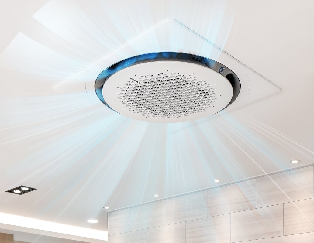Volle Leistung. 360° Komfort. Stilvolles Design. Die Samsung 360 Cassette revolutioniert die Deckenkassetten-Klimatisierung mit einem lüchtlosen Rundum-Luftauslass. Ob im Hotel, Büro oder Showroom – sie liefert gleichmäßige Luftverteilung ohne Zugerscheinung, ist flüsterleise im Betrieb und ein echter Blickfang an der Decke.
