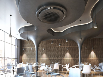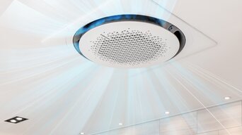 Ihr innovatives, kreisrundes Design macht die 360 Cassette zu einem echten Gestaltungselement. Sie lässt sich nahtlos in unterschiedlichste architektonische Umgebungen integrieren – von minimalistischen Büros bis hin zu repräsentativen Empfangsbereichen. Der moderne, reduzierte Look wirkt gleichzeitig dezent und hochwertig. Durch die runde Geometrie entsteht ein harmonisches Gesamtbild an der Decke, das sich klar von klassischen Kassettengeräten abhebt und durch das sanfte LED-Display zusätzlich aufgewertet wird.